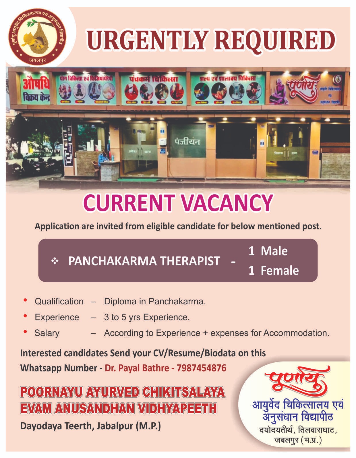 Vacancy For Panchakarma Therapist At Poornayu Ayurved Chikitsalaya evam Anusandhan Vidyapeeth