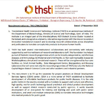 Vacancy for the post of Clinical Research Associate Homeo, Translational Health Science and Technology Institute, Faridabad.