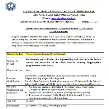 Vacancy for the post of Project Technical Support Homeo, All India Institute of Medical Sciences, Bhopal.