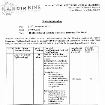 Walk-in for the post of Junior Consultant Homeo, ICMR-National Institute of Medical Statistics, New Delhi.