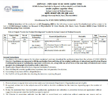 Walk-in for the post of Senior Research Fellow Homeo, ICMR-National Institute for Research in Reproductive and Child Health, Mumbai.