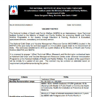 Vacancy for the post of Technical Officer Homeo, National Institute of Health and Family Welfare, New Delhi.