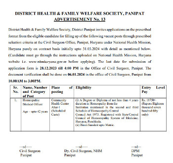 Vacancy for the post of Homeopathic Medical Officer, District Health & Family Welfare Society, Panipat.