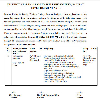 Vacancy for the post of Homeopathic Specialist, District Health & Family Welfare Society, Panipat.