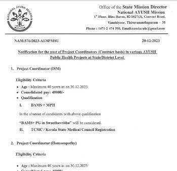 Vacancy for the post of Project Coordinator Homeopathy, National AYUSH Mission.