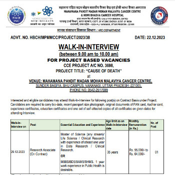 Walk-in for the post of Research Associate Homeo, TMC-Mahamana Pandit Madan Mohan Malaviya Cancer Centre.