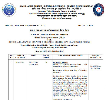 Walk-in for the post of Physician Assistant Homeo, TMC-Homi Bhabha Cancer Hospital & Research Centre, New Chandigarh.