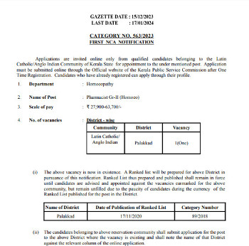 Vacancy for the post of Pharmacist Gr-II Homeo, Kerala Public Service Commission.