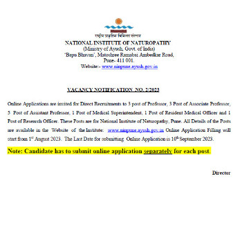 Vacancy for Various Yoga posts, National Institute of Naturopathy, Pune.