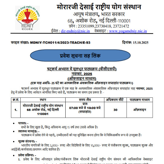 Admission Notice for Basic Course in Shatkarma Practices (BCSP),