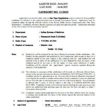 Vacancy for the post of Pharmacist Grade II (Siddha),