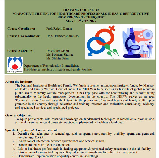 Training Course on "Capacity Building for Healthcare Professionals in Basic Reproductive Biomedicine Techniques", Organized by National Institute of Health and Family Welfare, New Delhi.