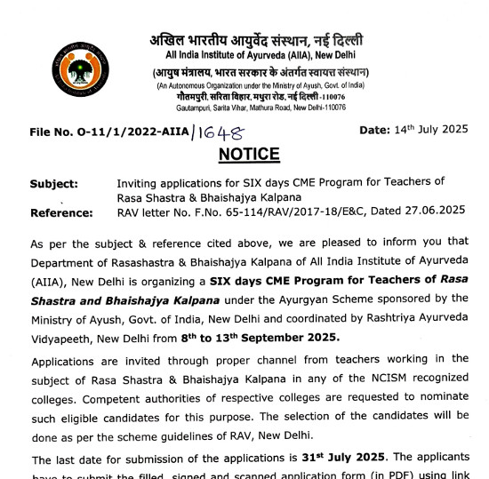 SIX Days CME Program for Teachers of Rasa Shastra and Bhaishajya Kalpana, Organized by All India Institute of Ayurveda, New Delhi.
