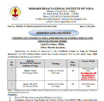 Admission Notice for Certificate Course in Yoga for Protocol Instructor (Offline/Online Mode), Morarji Desai National Institute of Yoga, New Delhi.