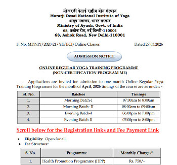 Admission Notice for Online Regular Yoga Training Programme, Morarji Desai National Institute of Yoga, New Delhi.