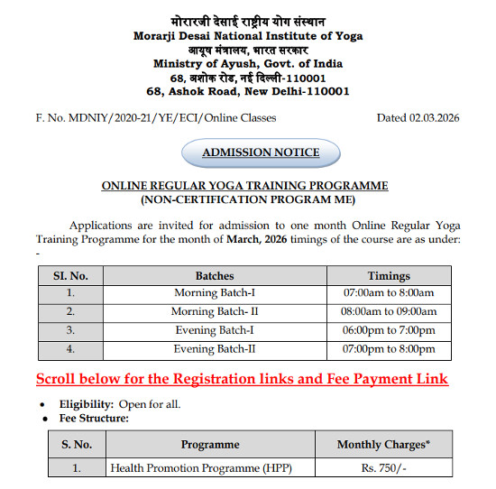 Admission Notice for Online Regular Yoga Training Programme,