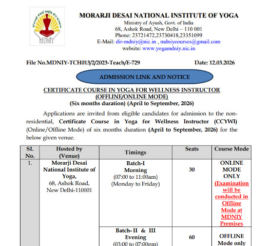 Admission Notice for Certificate Course in Yoga for Wellness Instructor, Morarji Desai National Institute of Yoga, New Delhi.