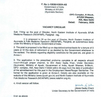 Vacancy for the post of Director, North Eastern Institute of Ayurveda & Folk Medicine Research, Pasighat.