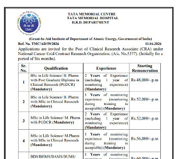 Vacancy for the post of Clinical Research Associate, Tata Memorial Centre.