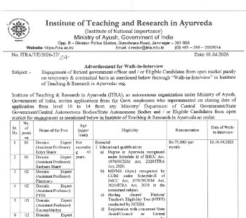 Walk-in Interview for the posts of Domain Expert, Institute of Teaching & Research in Ayurveda, Jamnagar.