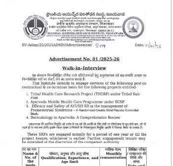 Walk-in Interview for the post of Senior Research Fellow (Ay.), Regional Ayurveda Research Institute, Vijayawada.