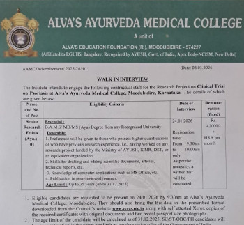 Walk-in Interview for the post of Senior Research Fellow (Ay.), Alvas Ayurveda Medical College, Karnataka.