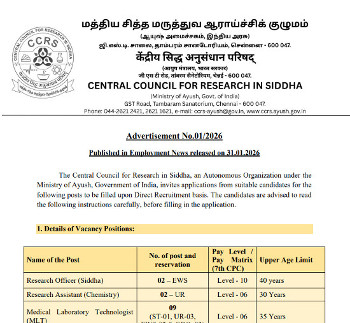 Vacancy for the post of Research Officer (Siddha),