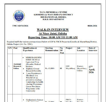Walk-in Interview for the post of Assistant Research Fellow (Unani), Tata Memorial Centre, Odisha.