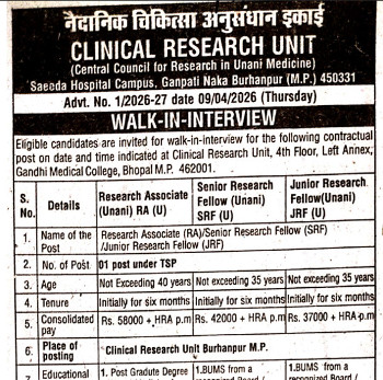 Walk-in Interview for the posts of Research Associate, Senior Research Fellow & Junior Research Fellow (Unani), Clinical Research Unit, Burhanpur.