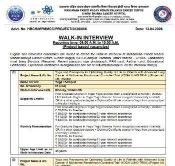 Walk-in Interview for the post of Clinical Research Monitor (Unani), Mahamana Pandit Madan Mohan Malviya Cancer Centre, Varanasi.