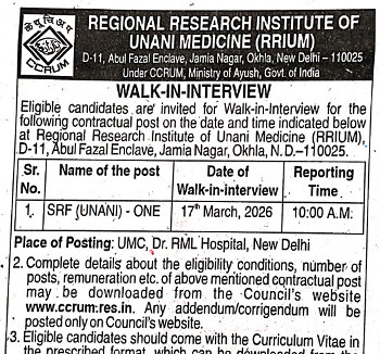Walk-in Interview for the post of SRF (Unani), Regional Research Institute of Unani Medicine, New Delhi.