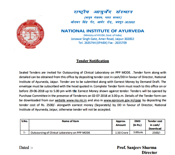 Tenders are invited for Outsourcing of Clinical Laboratory on PPP MODE, organized by National Institute Of Ayurveda, Jaipur.