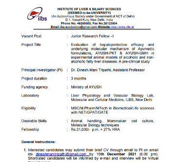 Vacancy for the post of Junior Research Fellow (MSc), Institute Of Liver & Biliary Sciences, New Delhi.
