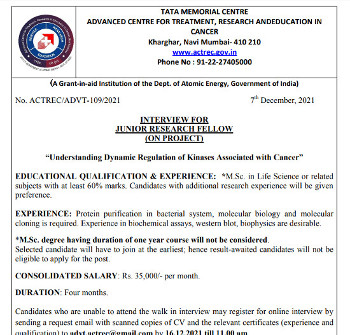 Walk-in Interview for the post of Junior Research Fellow, Tata Memorial Centre-ACTREC, Mumbai.