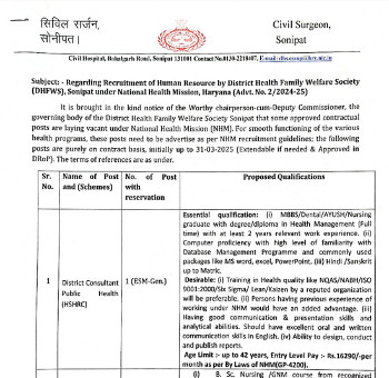 Vacancy for the post of District Consultant AYUSH, District Health & Family Welfare Society, Sonipat.