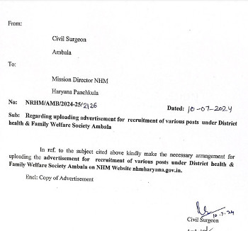 Vacancy for Various AYUSH posts, District Health & Family Welfare Society, Ambala.