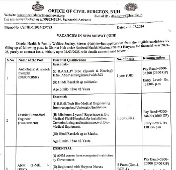 Vacancy for Various AYUSH posts, District Health & Family Welfare Society, Nuh.