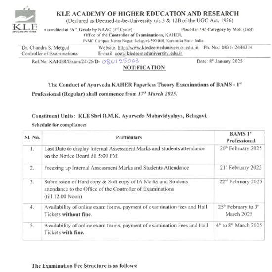 Admission Notice for Conduct of Ayurveda KAHER Paperless Theory Examinations of BAMS, K.L.E. Academy of Higher Education & Research, Belagavi.
