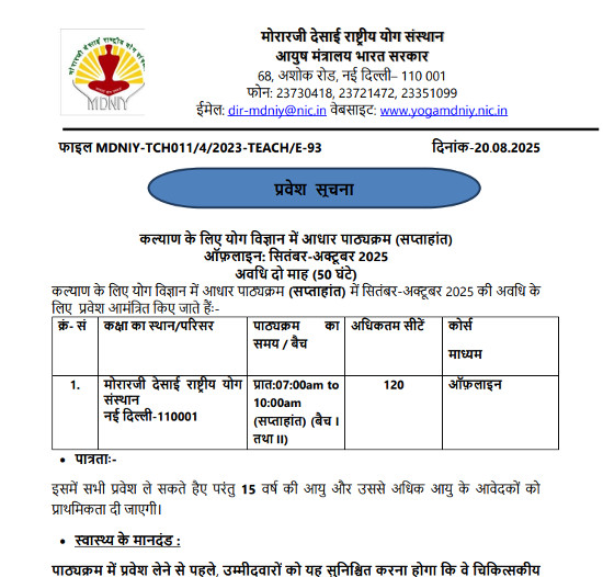 Admission Notice for Foundation Course in Yoga Science for Wellness (Weekend Course - Offline Mode), Morarji Desai National Institute of Yoga, New Delhi.