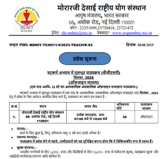 Admission Notice for Basic Course in Shatkarma Practices (BCSP),