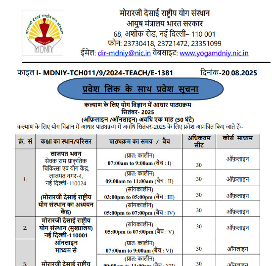 Admission Notice for Foundation Course in Yoga Science for Wellness (FCYScW) (Online/Offline), Morarji Desai National Institute of Yoga, New Delhi.