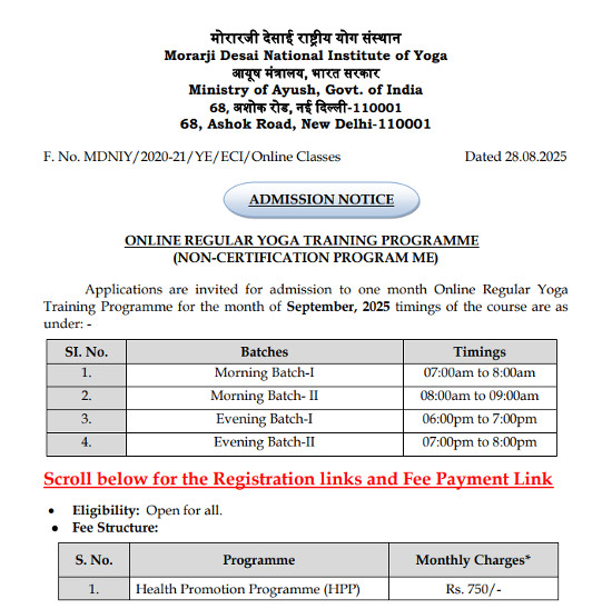 Admission Notice for Online Regular Yoga Training Programme (Non-Certification), Morarji Desai National Institute of Yoga, New Delhi.