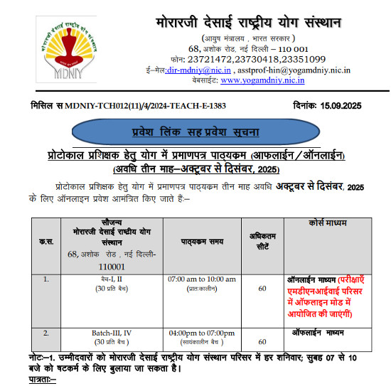 Admission Notice for Certificate Course in Yoga for Protocol Instructor, Morarji Desai National Institute of Yoga, New Delhi.