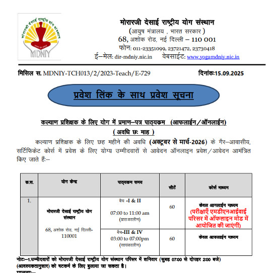 Admission Notice for Certificate Course in Yoga for Wellness Instructor (Offline/Online Mode), Morarji Desai National Institute of Yoga, New Delhi.