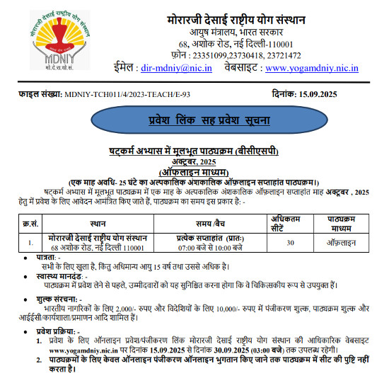 Admission Notice for Basic Course in Shatkarma Practices (BCSP-OFFLINE MODE), Morarji Desai National Institute of Yoga, New Delhi.