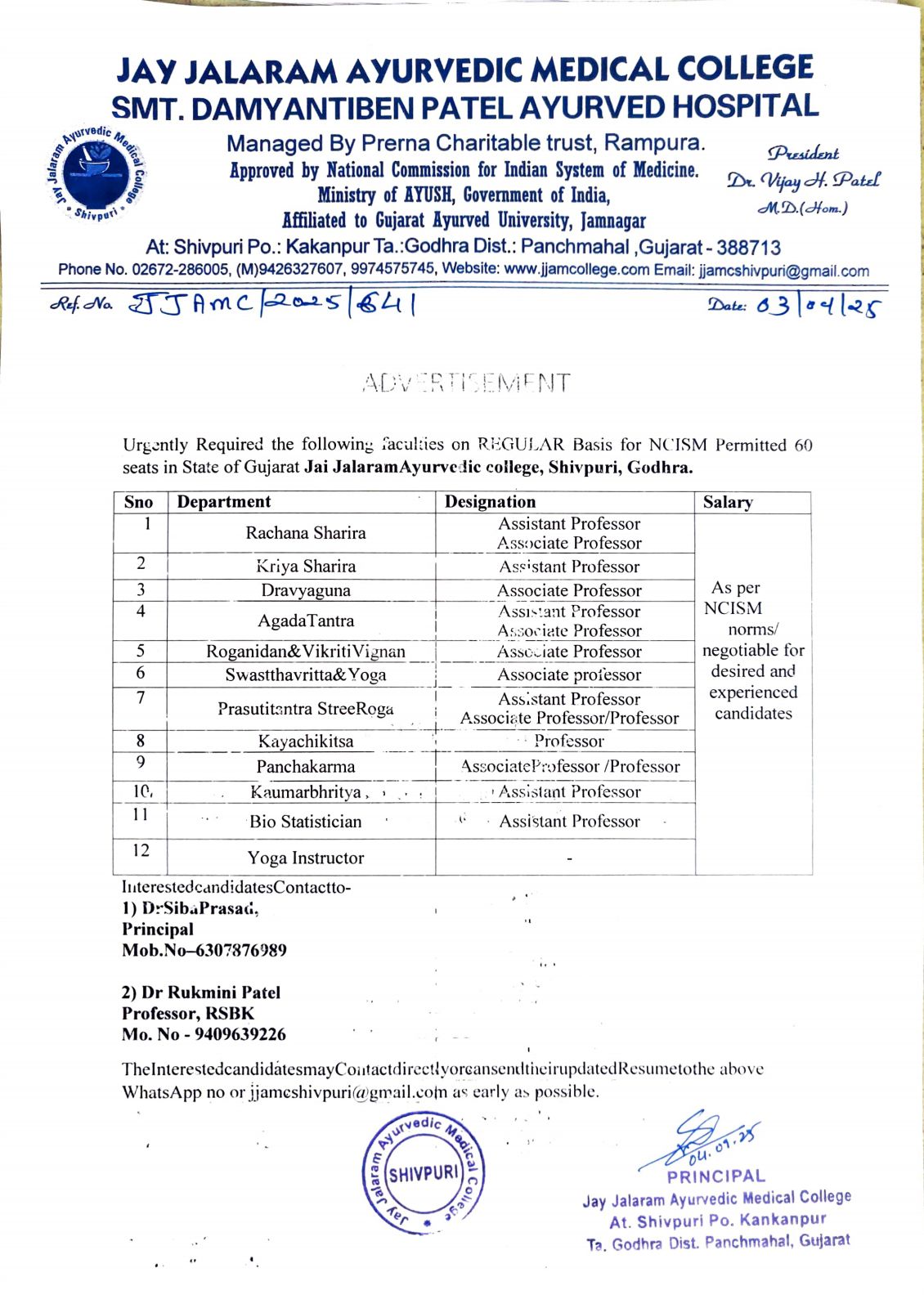 Jai Jalaram Ayurvedic Medical College Faculty Recruitment 2025 - Assistant & Associate Professor Jobs in Gujarat
