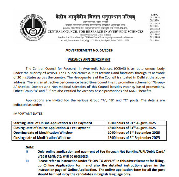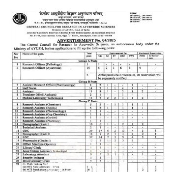 Job Code : 15 Vacancy for Various Ayurveda posts, Central Council for Research in Ayurvedic Sciences, New Delhi.