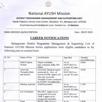 Job Code : 13 Vacancy for Various Ayurveda posts, National AYUSH Mission, Malappuram.