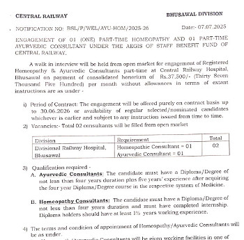 Job Code : 14 Walk-in Interview for the post of Ayurvedic Consultant, Central Railway.