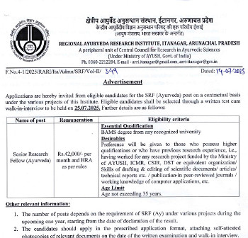 Job Code : 17 Walk-in Interview for the post of Senior Research Fellow (Ayurveda), Regional Ayurveda Research Institute, Arunachal Pradesh.
